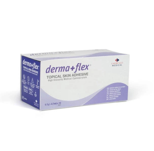 Dermaflex is an excellent alternative to applying bandages to open wounds, especially on areas which are prone to flexing and moisture. The adhesive is sterile and contains a mixture of Octyl and Butyl cyanoacrylates which provide its flexibility and fast setting time. The highly viscous nature of the adhesive, coupled with the quick setting time, makes it a perfect choice for use in an emergency to quickly stop bleeding and promote the healing process. The flexible nature of Dermaflex also means it comes supplied with two different types of applicator; a nozzle and dauber top. The nozzle is primarily used to apply when cosmetics is being considered while the dauber top is often used for precise application to larger areas. Dermaflex has the added benefit of being solvent-free and purple in colour, providing excellent visibility of where its been applied.