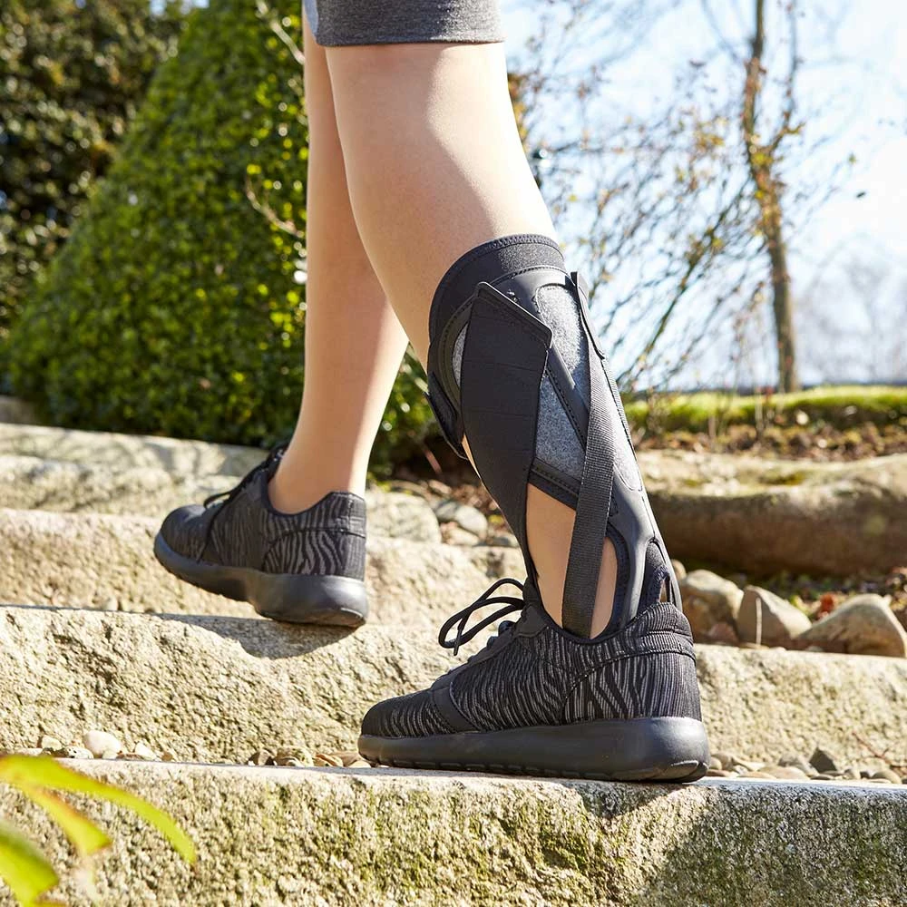 The brace provides adjustable elastic straps which allows the degree of dynamic foot lift during the swing phase to be determined based on the individual needs of the user. On heel strike, the limiting function of the elastic straps ensures a well-controlled plantar flexion. During the stance phase, the brace allows flexion and extension in the ankle joint and allows the (remaining) function of the calf muscles to be focused on during the rolling of the foot. The outcome is an efficient and natural gait.