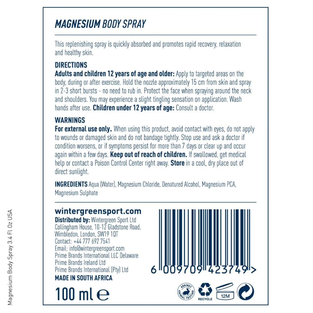 Magnesium body spray absorbs straight through the skin into the blood stream and into the muscles, replenishing lost magnesium fast, either stopping the cramping sensation that has begun or preventing the muscle from cramping before it starts. The quickest and easiest way to get pure magnesium sulphate into the system in a non- tactile, hygienic way, perfect when one is sweaty, wet or dirty from a work out. Its water base formula means it leaves no oily residue and all one might feel is a tingling sensation on the skin when it is applied.